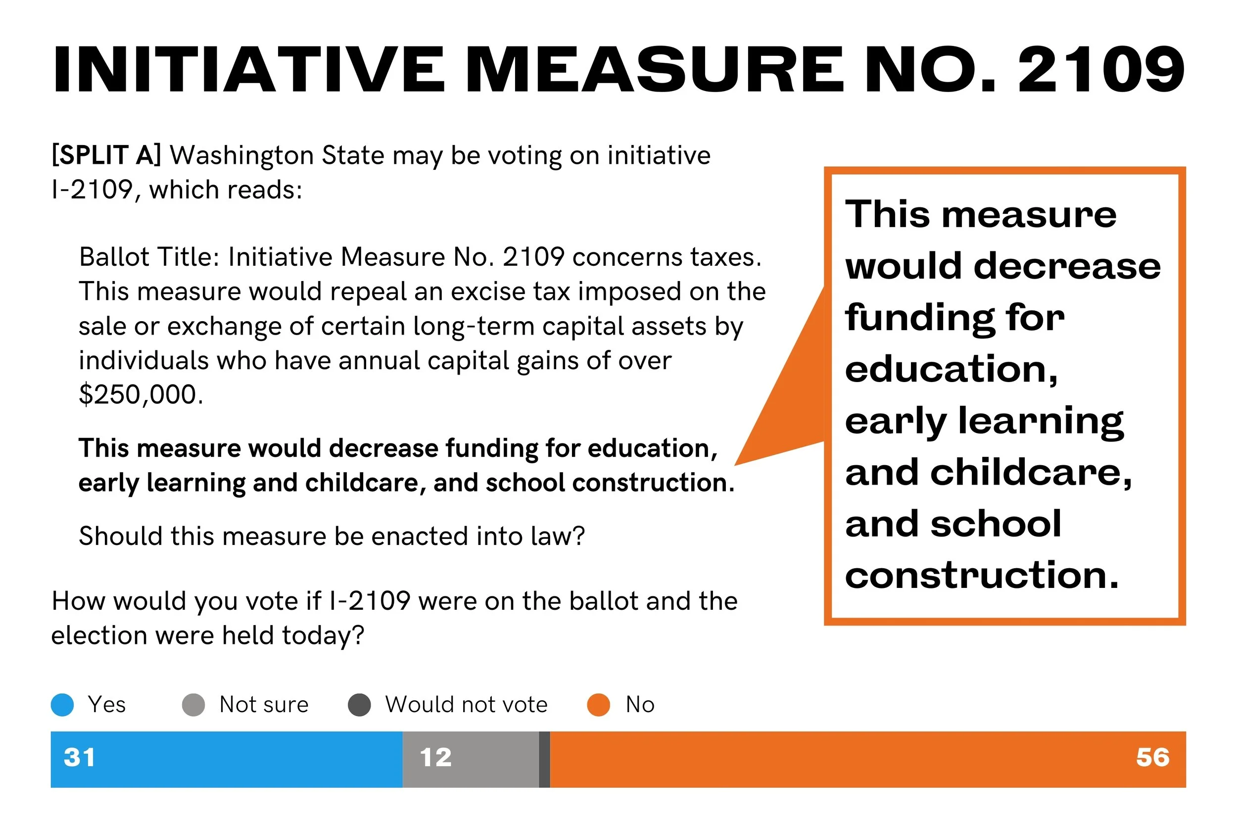 In an April 2024 poll, the three initiatives fell far below the 50% needed to pass, especially when the 10 words of the public investment impact statement was included. For example, on I-2109 just 31% of voters said they would vote yes for a measure that “would decrease funding for education, early learning and childcare, and school construction.”